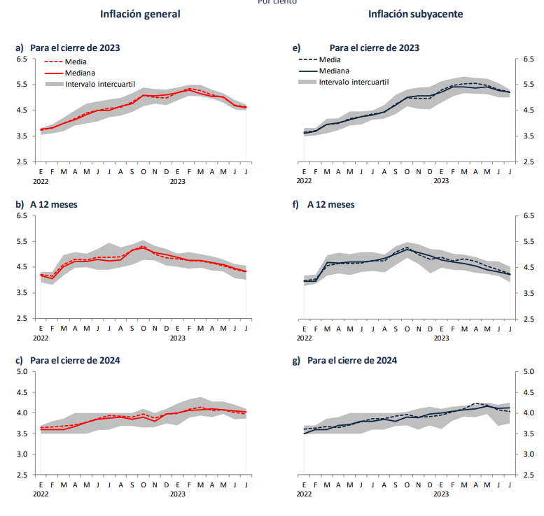 La inflación subyacente también se reduciría al concluir el 2023. Las expectativas promediadas en junio fueron de 5.26 por ciento y para el mes de julio descendieron a 5.20. Para diciembre del 2024, este indicador presentó un incremento en las estimaciones, de 4.11 calculado en junio, aumentó a 4.13 para el mes de julio.