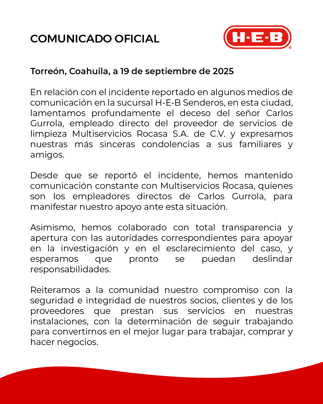 Por su parte, HEB Senderos emitió un comunicado deslindándose del incidente, al señalar que Carlos era empleado de Multiservicios Rocasa y no de la tienda directamente. Aseguraron colaborar con las autoridades y reiteraron su compromiso con la seguridad de sus empleados, clientes y proveedores.