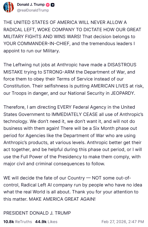 — Secretary of War Pete Hegseth (@SecWar) February 27, 2026