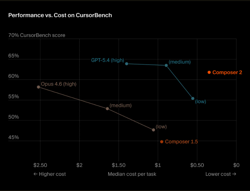 Las gráficas de Cursor no demostraban limpiamente que Composer 2 fuera “mejor que todos” en términos absolutos. Lo que mostraban era, sobre todo, una relación favorable entre score en CursorBench y costo mediano por tarea, además de comparaciones de tokens por segundo y precio por millón de tokens bajo supuestos definidos por la propia empresa. En la práctica, el mensaje visual era más amplio que la conclusión estrictamente demostrada: Composer 2 no necesariamente superaba a GPT-5.4 en calidad pura, sino que Cursor lo presentaba como más eficiente dentro de su propio marco de evaluación.