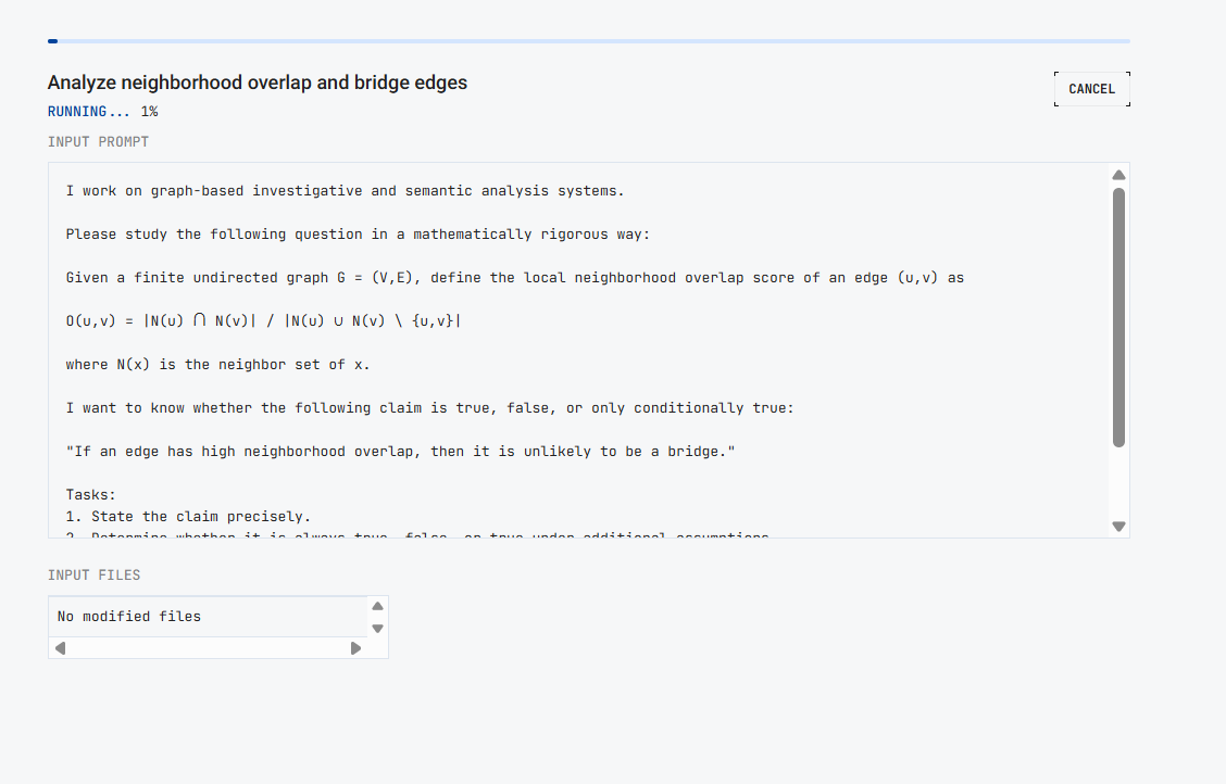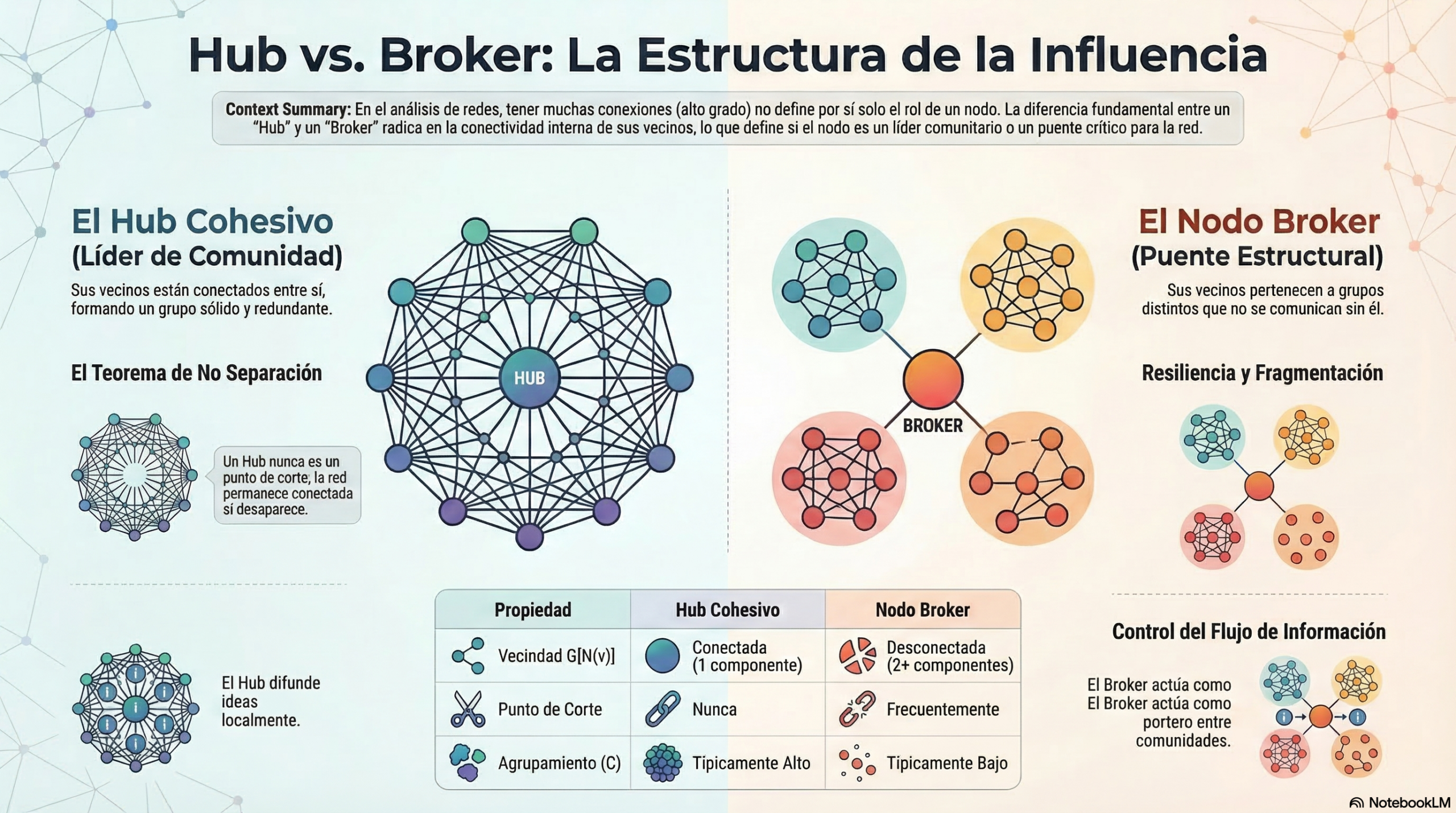 La segunda prueba fue más ambiciosa y, por eso mismo, más reveladora. En lugar de pedir una proposición cerrada, se le planteó una distinción muy cercana al problema del pseudoanálisis de redes sociales comunmente realizado por personas que no tienen conocimiento en teoría de grafos y fue previamente analizado por EstadoRed: cómo separar a un hub cohesivo de un broker que parece central solo porque conecta regiones débilmente relacionadas. Aquí Aristotle ya no solo respondió una afirmación puntual, sino que propuso un pequeño marco conceptual. Su criterio central fue mirar la conectividad del subgrafo inducido por la vecindad de un nodo G[N(v)]G[N(v)]: si la vecindad forma un bloque conectado, el nodo se parece más a un hub interno; si se fragmenta en varios grupos, se aproxima más a un broker.