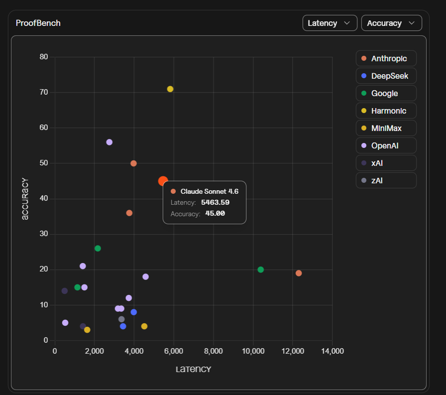 ProofBench: Accuracy vs Latency en modelos particpantes.
