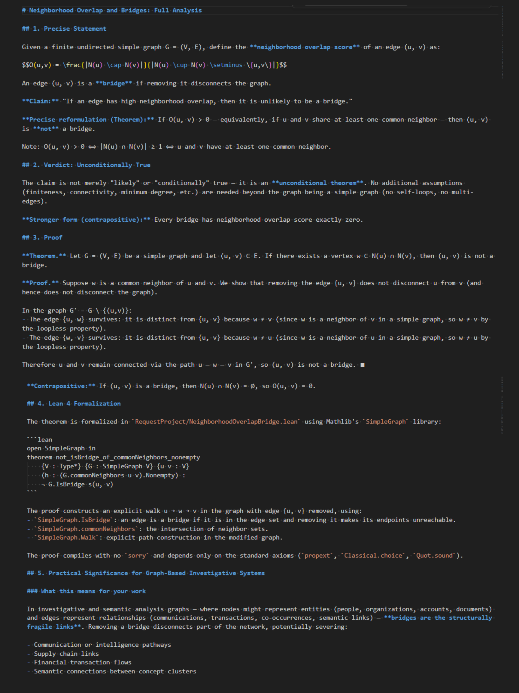 La pregunta original estaba formulada en lenguaje probabilístico, casi heurístico: “high overlap” e “unlikely”. Aristotle limpió esa ambigüedad y la transformó en un enunciado demostrable. La prueba que dio es corta y correcta: si los nodos uu y vv comparten un vecino ww, entonces aunque se elimine la arista (u,v)(u,v) todavía existe el camino alternativo u−w−vu-w-v, por lo que la arista no era un puente.