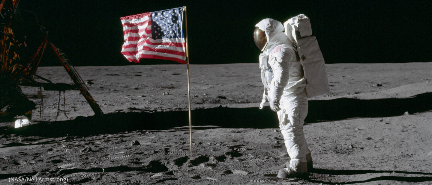 AS11-40-5875 (20 July 1969) — Astronaut Edwin E. Aldrin Jr., lunar module pilot of the first lunar landing mission, poses for a photograph beside the deployed United States flag during an Apollo 11 extravehicular activity (EVA) on the lunar surface. The Lunar Module (LM) is on the left, and the footprints of the astronauts are clearly visible in the soil of the moon. Astronaut Neil A. Armstrong, commander, took this picture with a 70mm Hasselblad lunar surface camera. While astronauts Armstrong and Aldrin descended in the LM, the «Eagle», to explore the Sea of Tranquility region of the moon, astronaut Michael Collins, command module pilot, remained with the Command and Service Modules (CSM) «Columbia» in lunar orbit. Photo credit: NASA