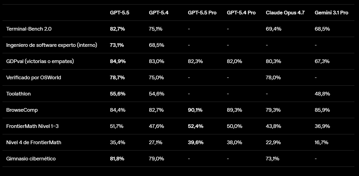 El lanzamiento busca también contrarrestar una narrativa que ha crecido en redes sociales sobre que OpenAI ha perdido tracción frente a Anthropic en la disputa por clientes empresariales. Según los benchmarks presentados por la compañía, GPT-5.5 supera al modelo Opus 4.7 de Anthropic en la mayoría de las pruebas estándar actuales.